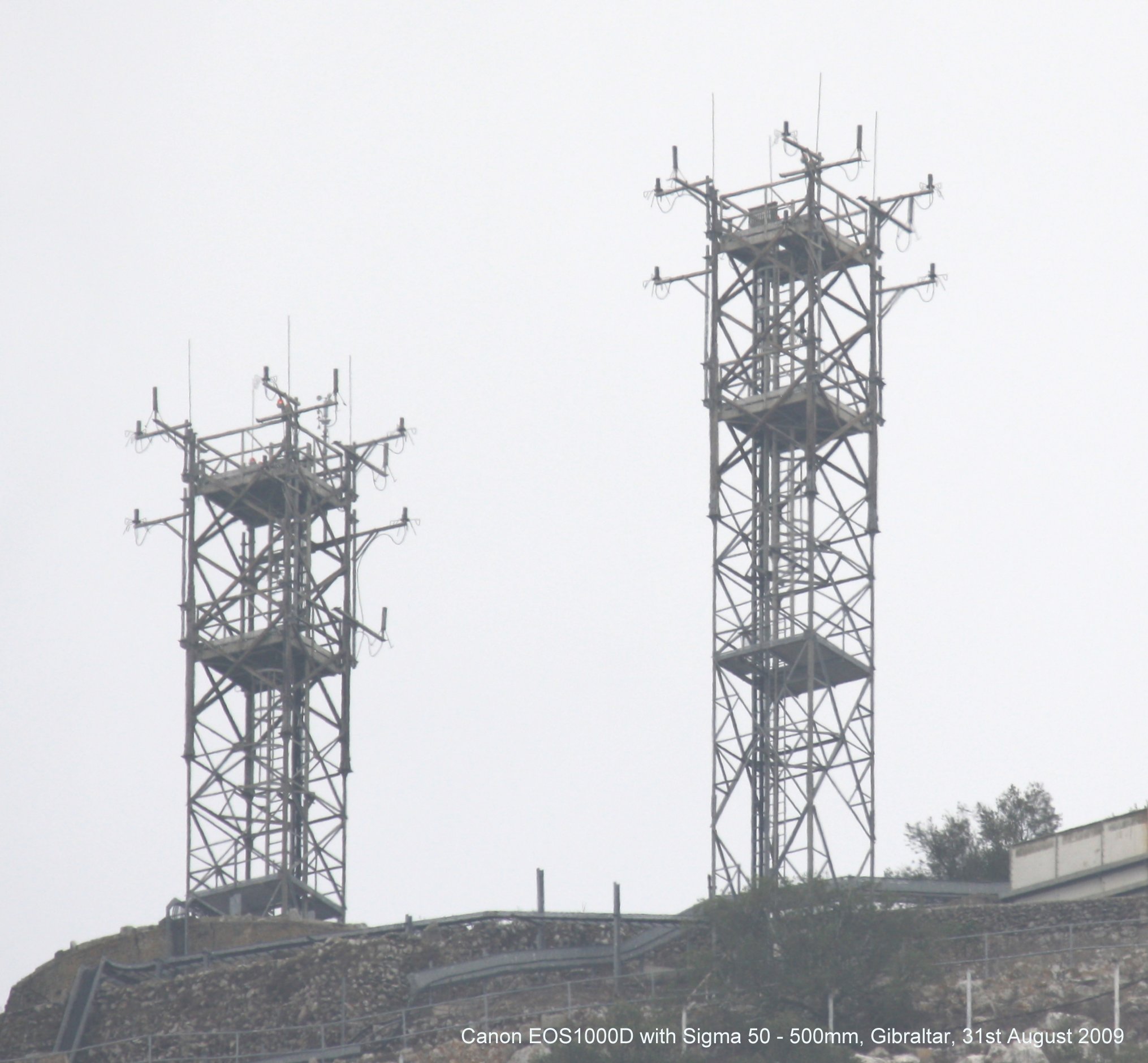 We set off on a walkabout. My girlfriend is carrying the Canon EOS1000D with the Sigma 50-500mm lens that really needs a wheelbarrow and I am carrying the Nikon Coolpix P90 which is very light and costs a fraction of the price. We take some hand held shots of the aerials on top of the rock which must be about a mile away. The pictures from the Coolpix are better.